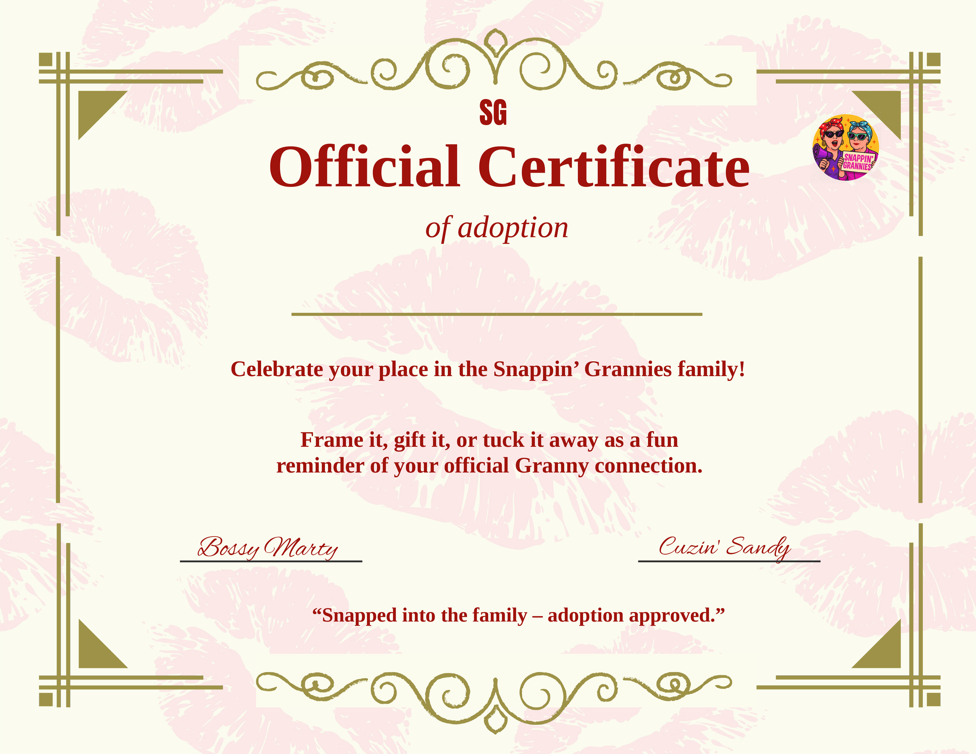 Welcome to the Snappin’ Grannies family. Your official Adoption Certificate is ready to download below. Frame it, share it, or just keep it as proof that you’ve got a Granny in your corner — filled with love, humor, and a dash of sass. 💕